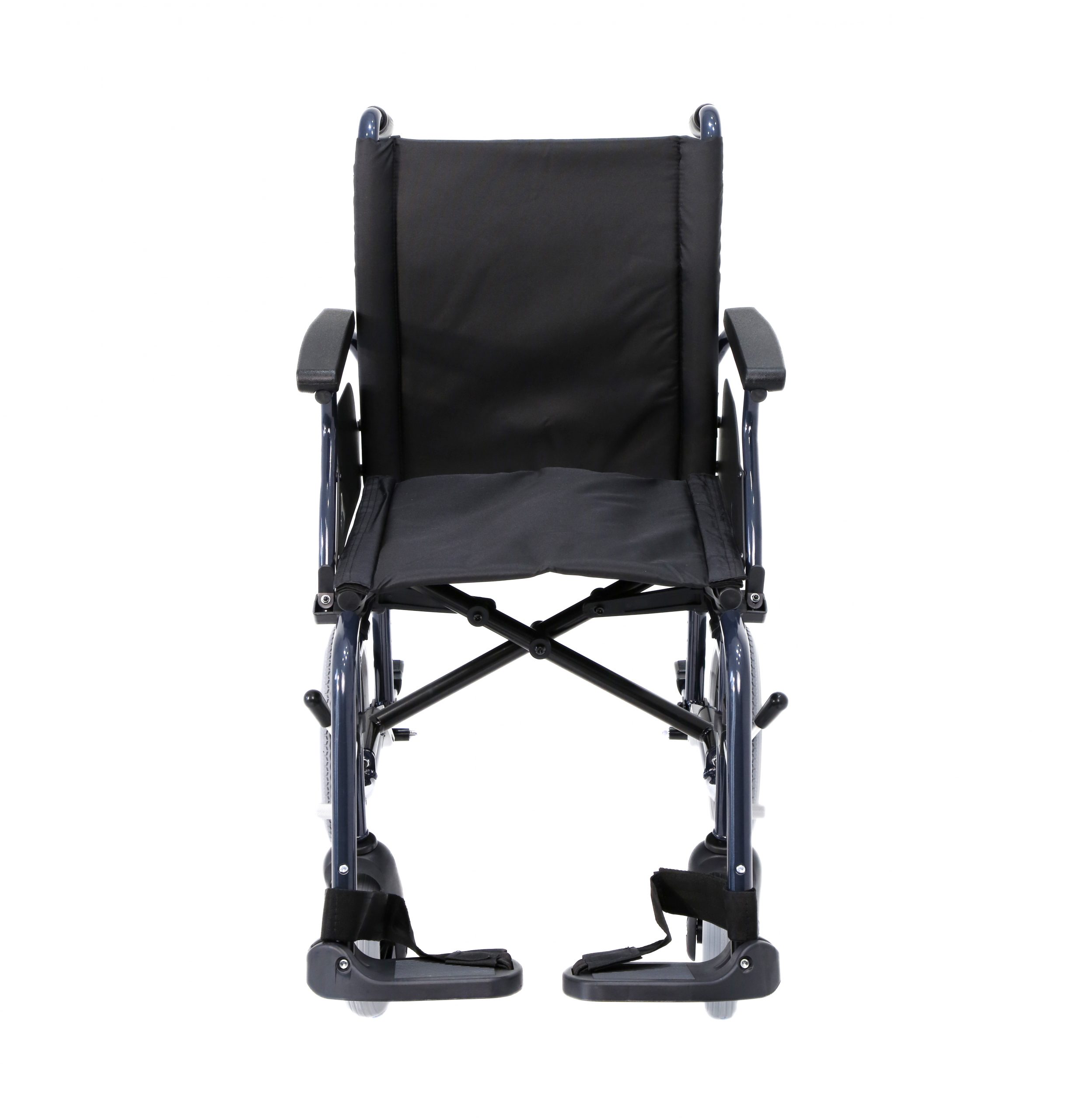 Silla de aluminio plegable, con apoyabrazos abatibles y apoyapiés extraíbles y regulables en altura. Ruedas delanteras de PU de 200 x 50 mm y traseras de PU de 300 mm anti pinchazos. Sistema de extracción rápida para las ruedas traseras (QR). Tapicería en nylon color negro.