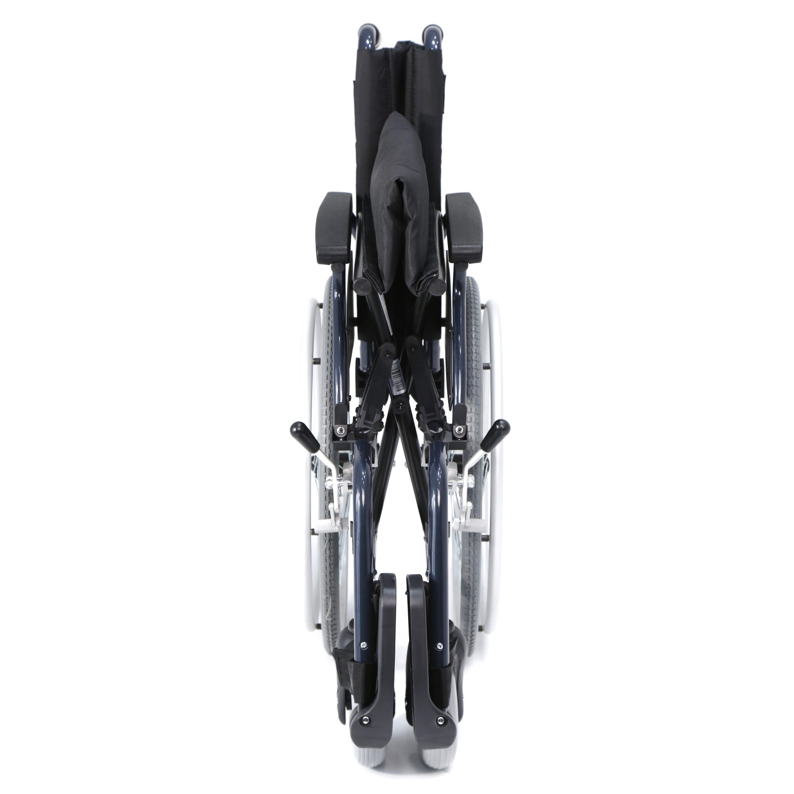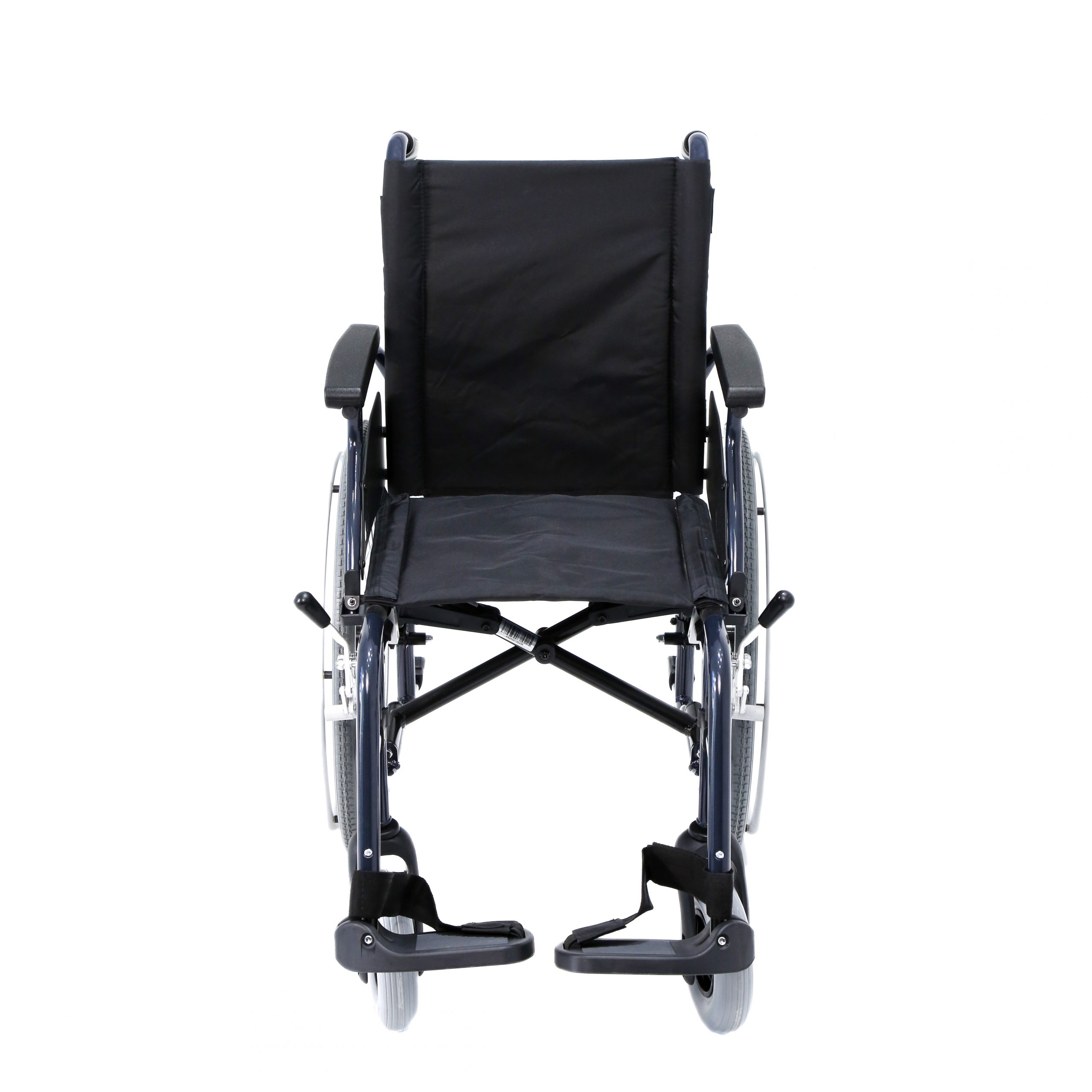Silla de aluminio plegable, con apoyabrazos abatibles y apoyapiés extraíbles y regulables en altura. Ruedas delanteras de PU de 200 x 50 mm y traseras de PU de 600 mm anti pinchazos. Sistema de extracción rápida para las ruedas traseras (QR). Tapicería en nylon color negro.