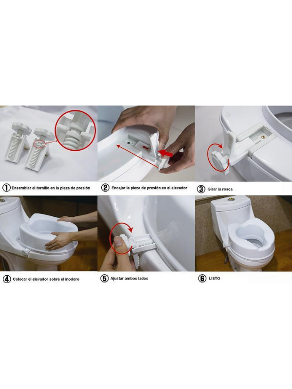Este elevador de inodoro con apoyabrazos es una solución sencilla para solventar la dificultad de los mayores o discapacitados cuando se sientan o levantan del inodoro. Facilita la limpieza porque es desmontable. Se fija en el frontal del inodoro mediante un cierre de presión. Se recomienda seguir el manual de instrucciones para su instalación.