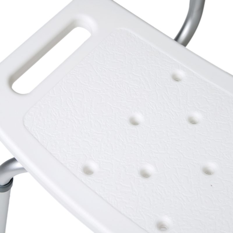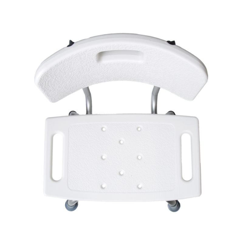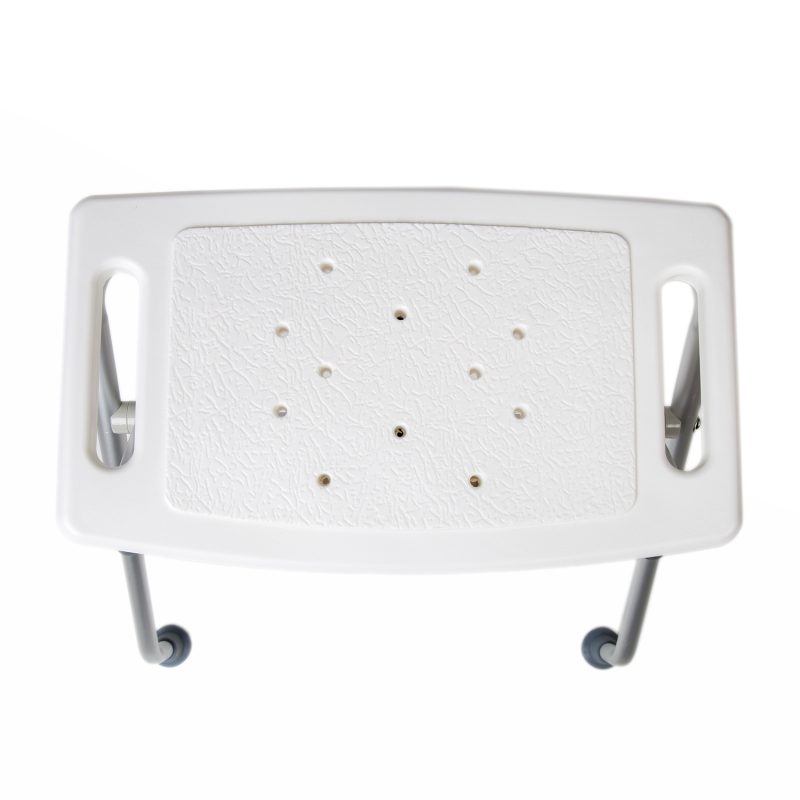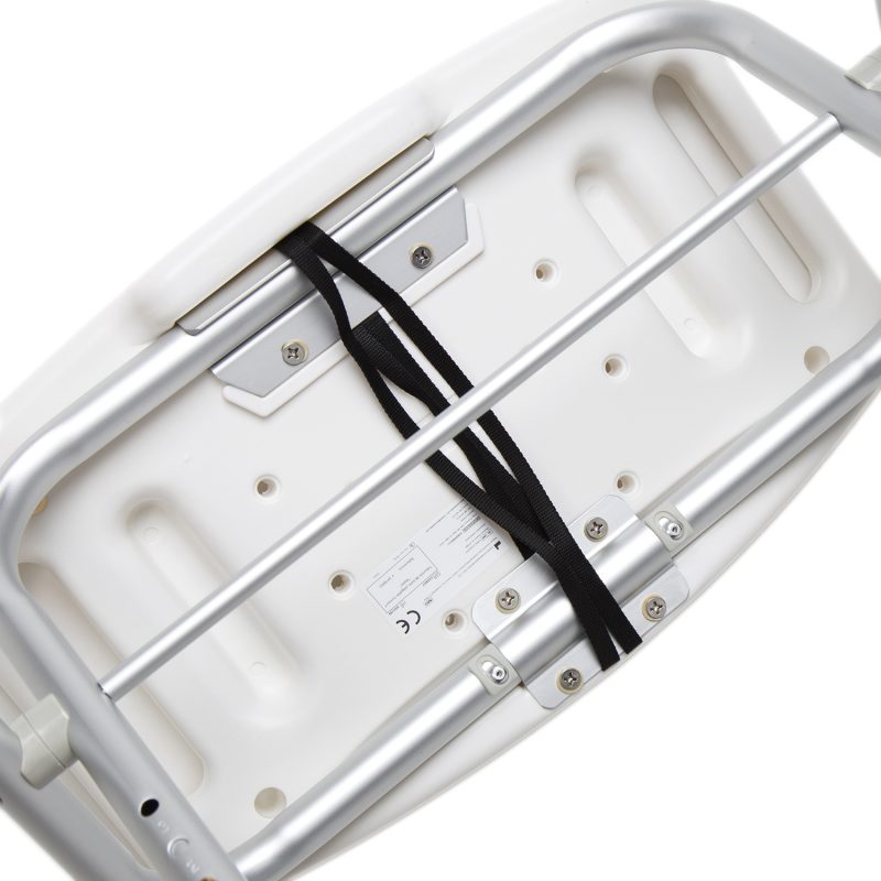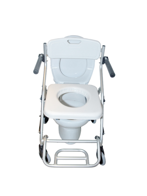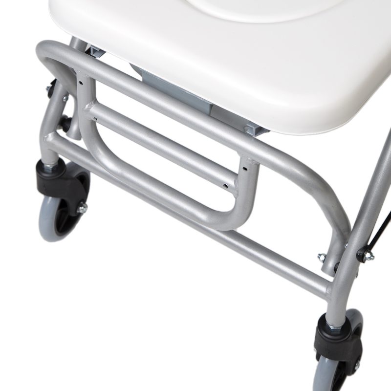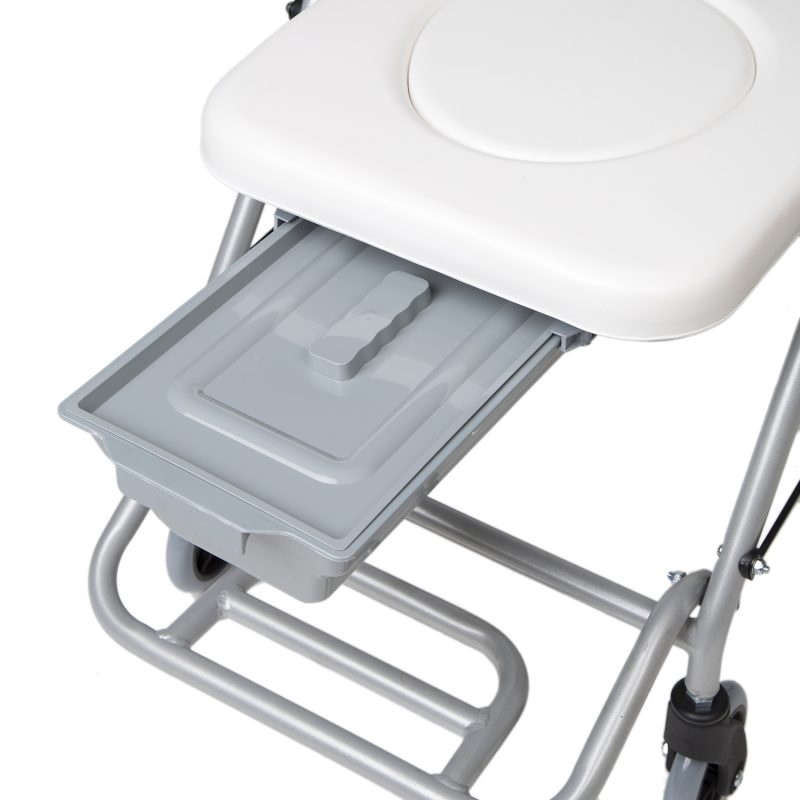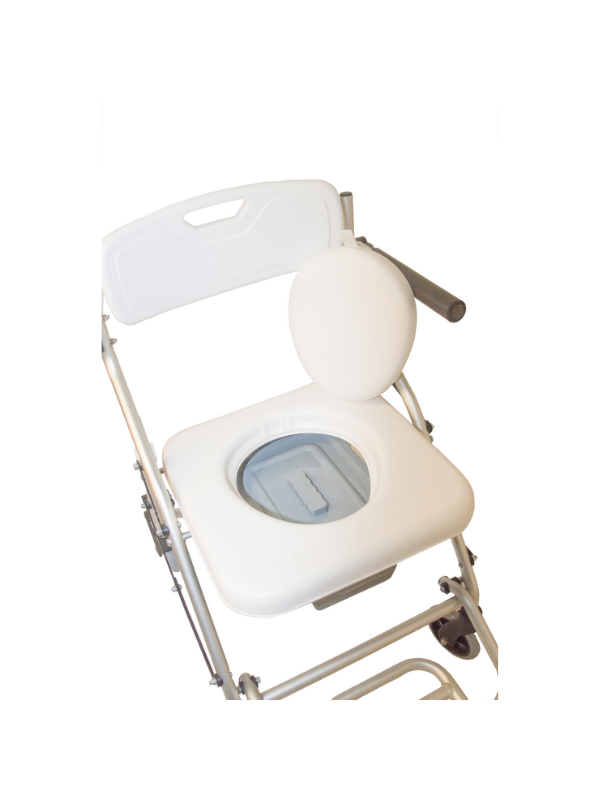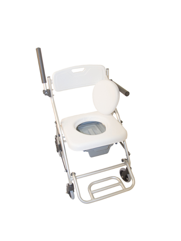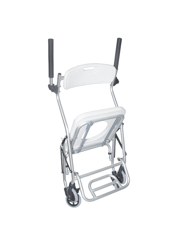 Realizada en aluminio y PVC sanitario, está diseñada para soportar un peso máximo de 100 Kg. Gracias a sus ruedas, tanto delanteras como traseras de 130 mm y a su estructura de aluminio, permite largos desplazamientos desde la habitación hasta el baño. Destaca por su ligereza, maniobrabilidad y plegado compacto.