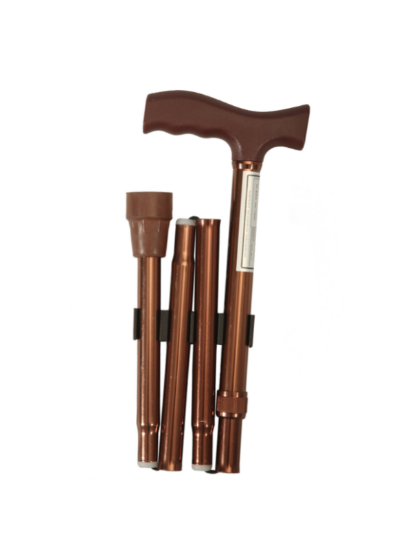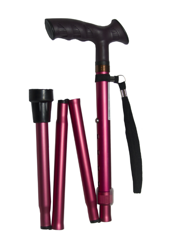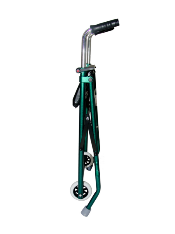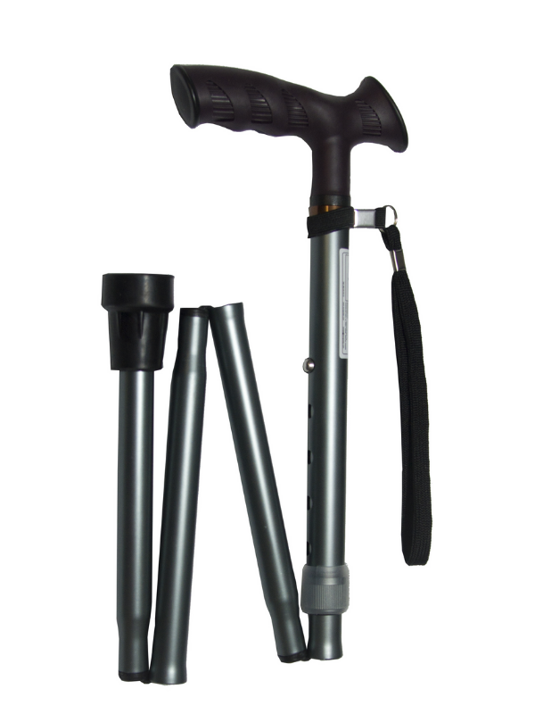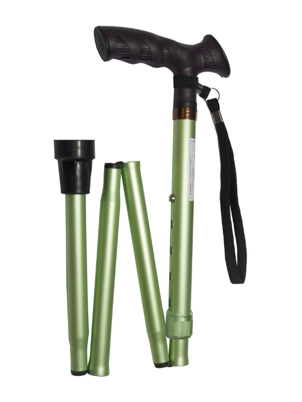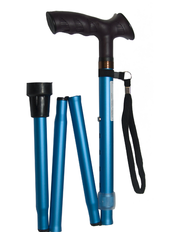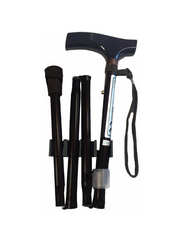 Muletilla de aluminio plegable, ,regulable en altura y con empuñadura blanda, anatómica, ambidiestra. Incluye cinta porta bastón. Contera de goma que favorece el agarre. Disponible en seis colores (negro, bronce, azul, rojo, verde y cobalto).