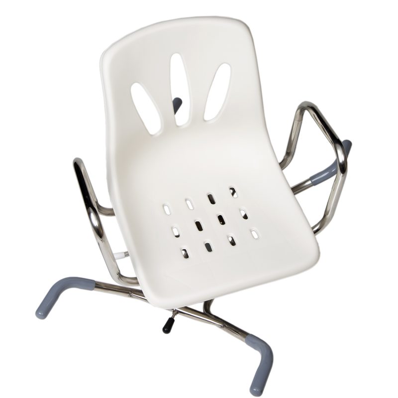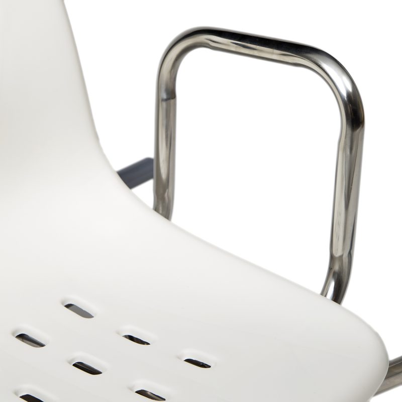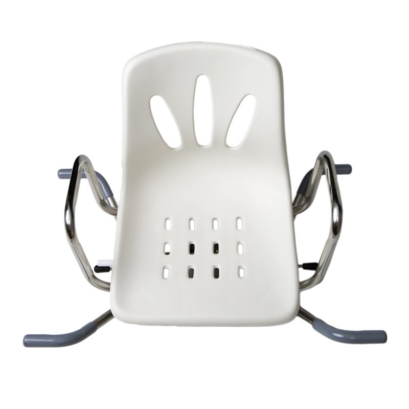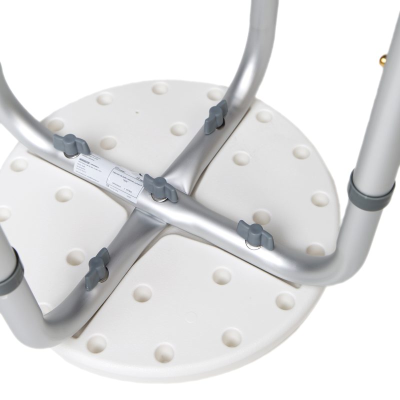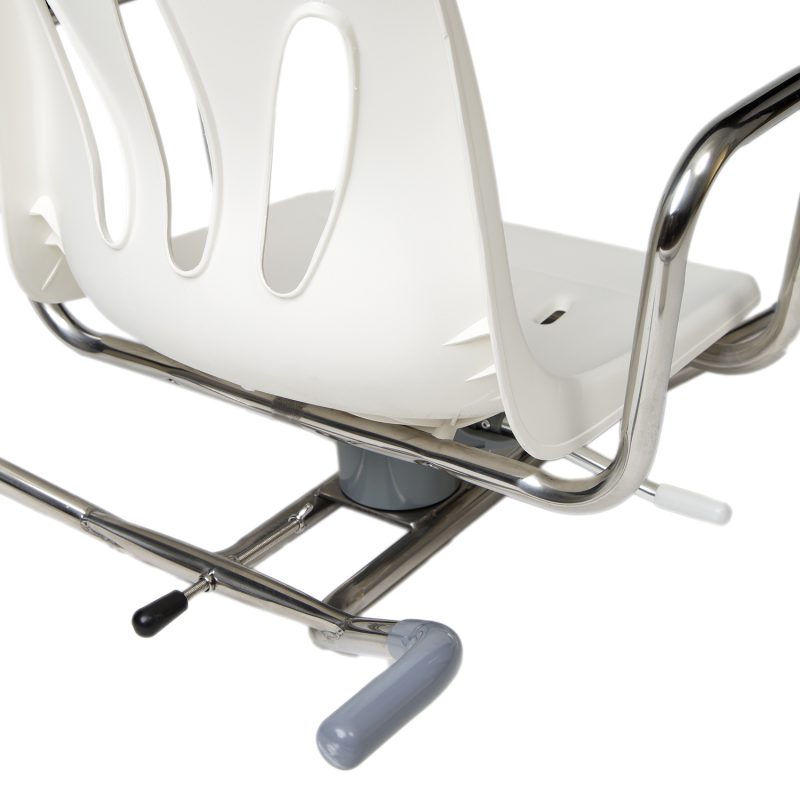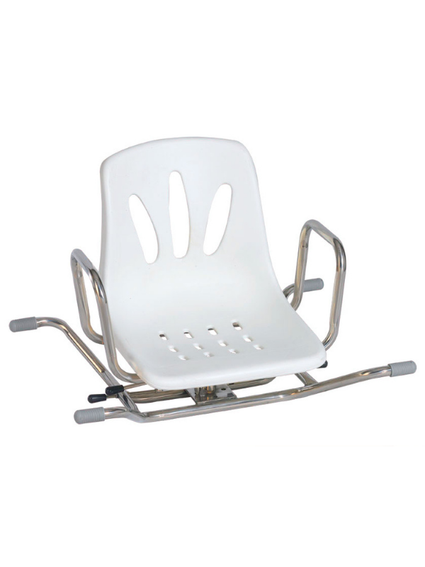 Fabricado en acero inoxidable. No requiere obras ni mantenimiento y se puede retirar para dejar libre la bañera. Lleva reposabrazos integrados y una palanca con 4 posiciones que puede bloquear el giro del asiento. El diseño del asiento impide deslizamientos y evacua el agua. Dos tornillos acolchados, lo aseguran en el interior de la bañera.