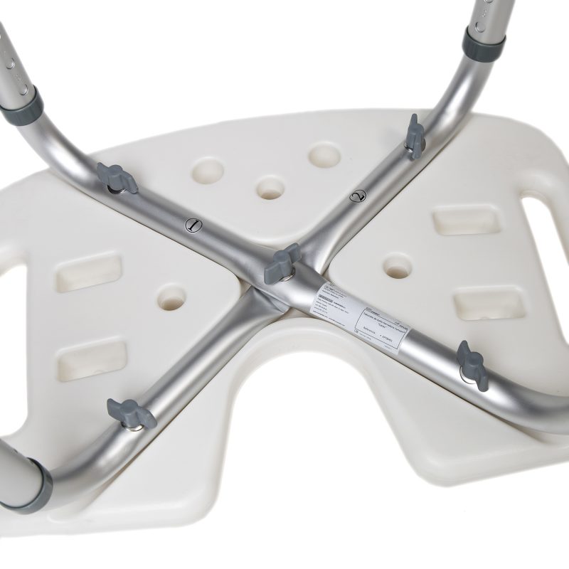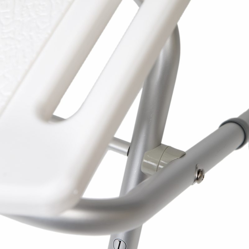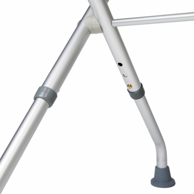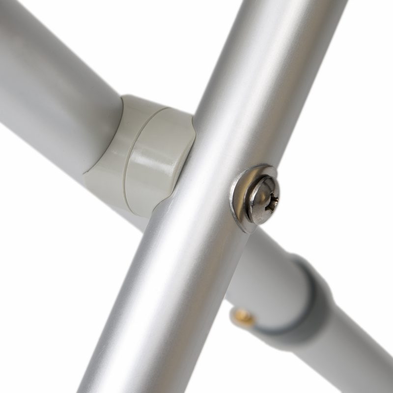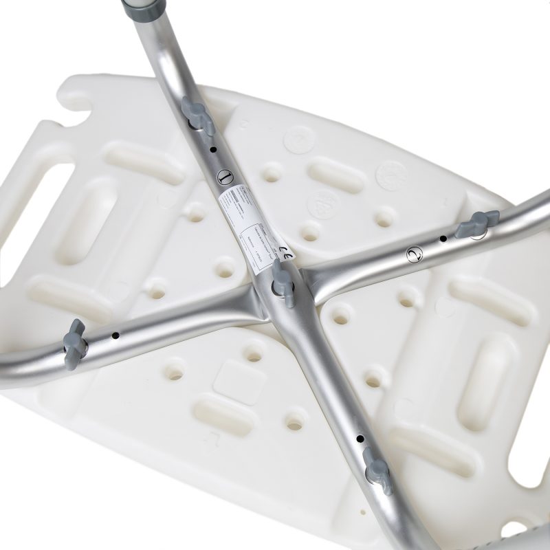 Fabricado en aluminio y PVC. Patas regulables en tres alturas. Altura asiento-suelo 47.5—52.5 cm. Peso máximo usuario: 100 Kg.