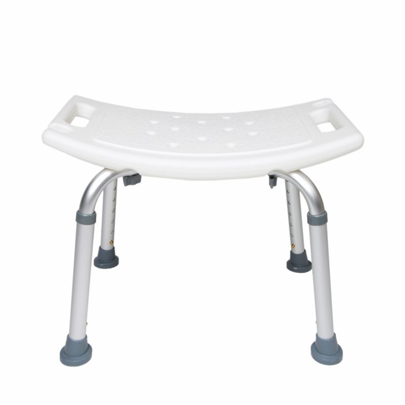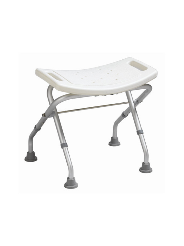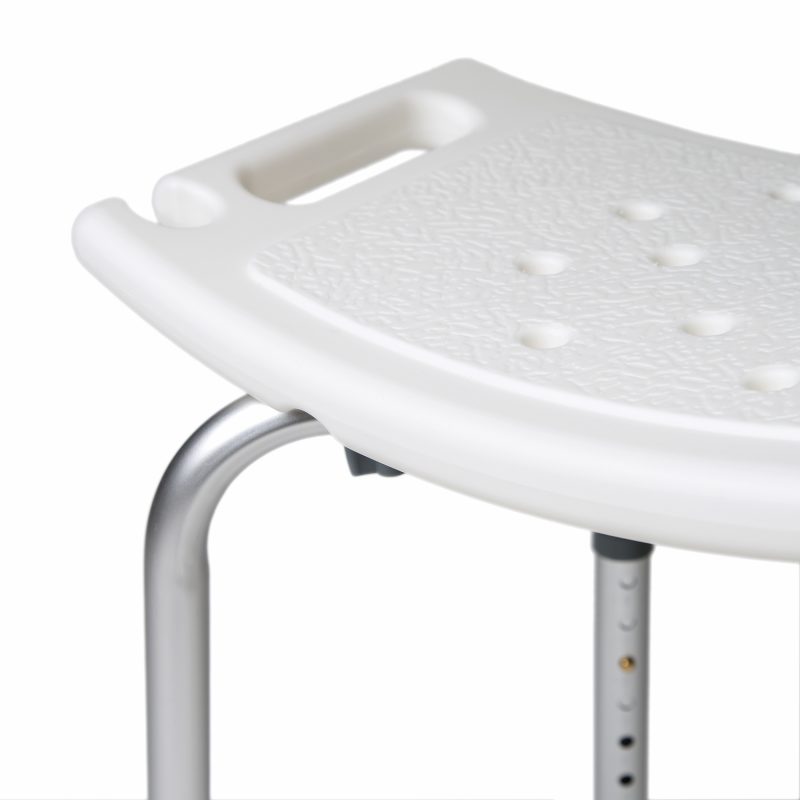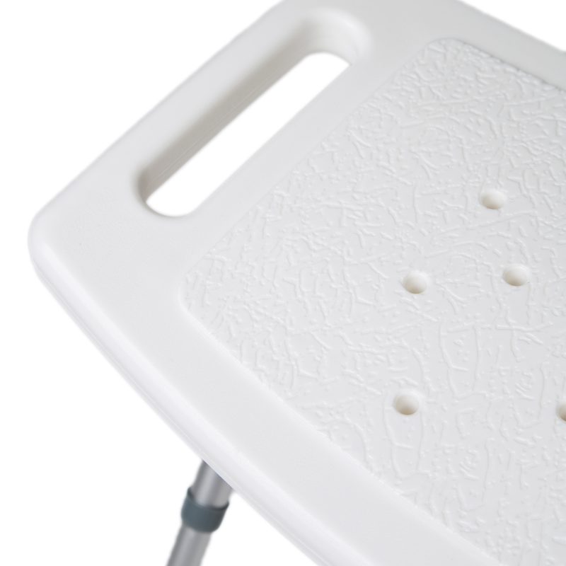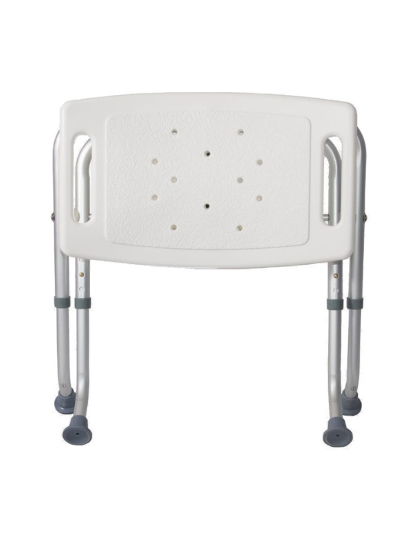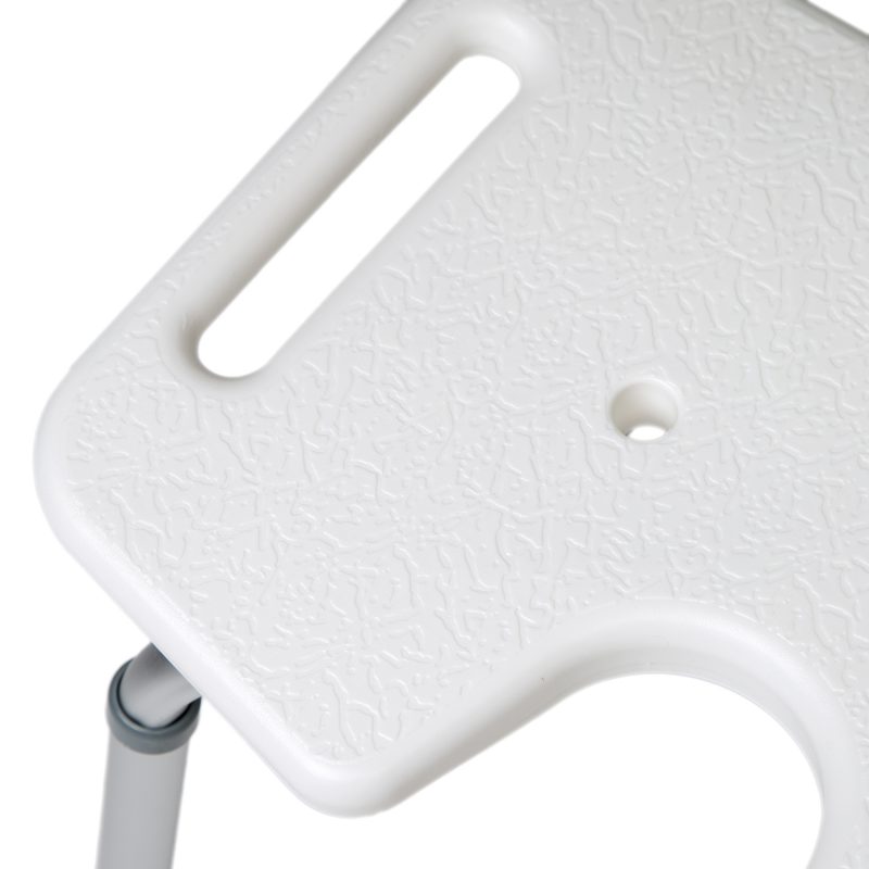 Fabricado en aluminio y PVC. Patas regulables en tres alturas. Altura asiento-suelo 47.5—52.5 cm. Peso máximo usuario: 100 Kg.