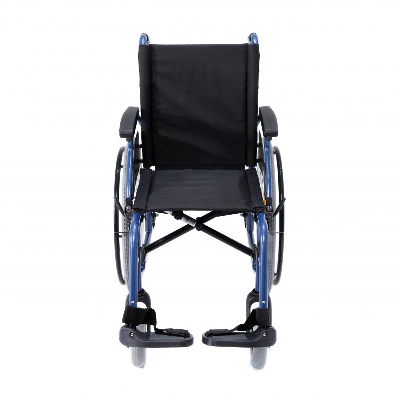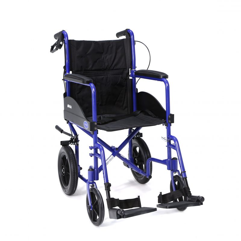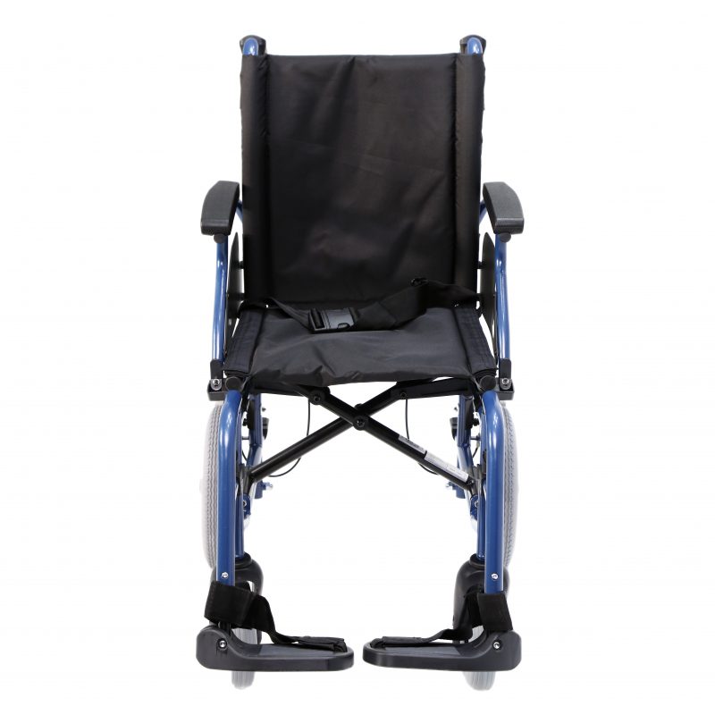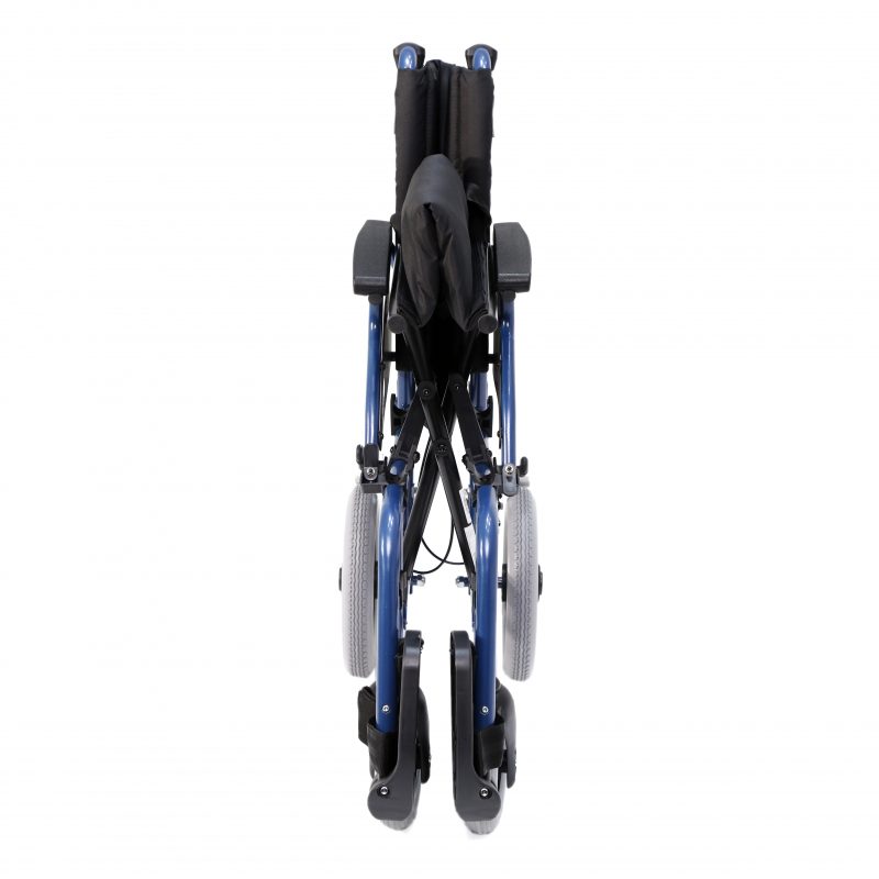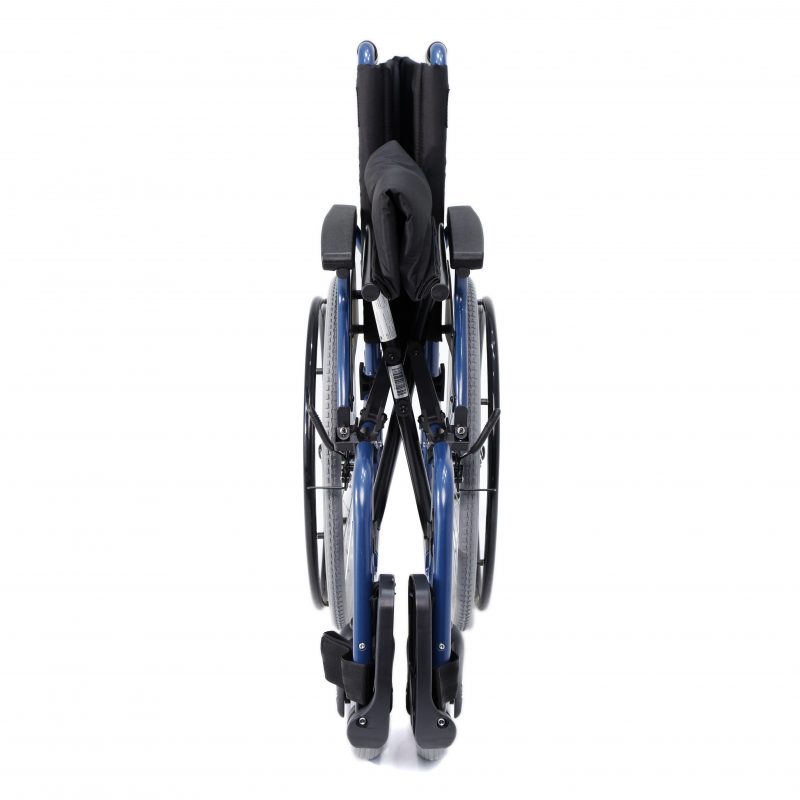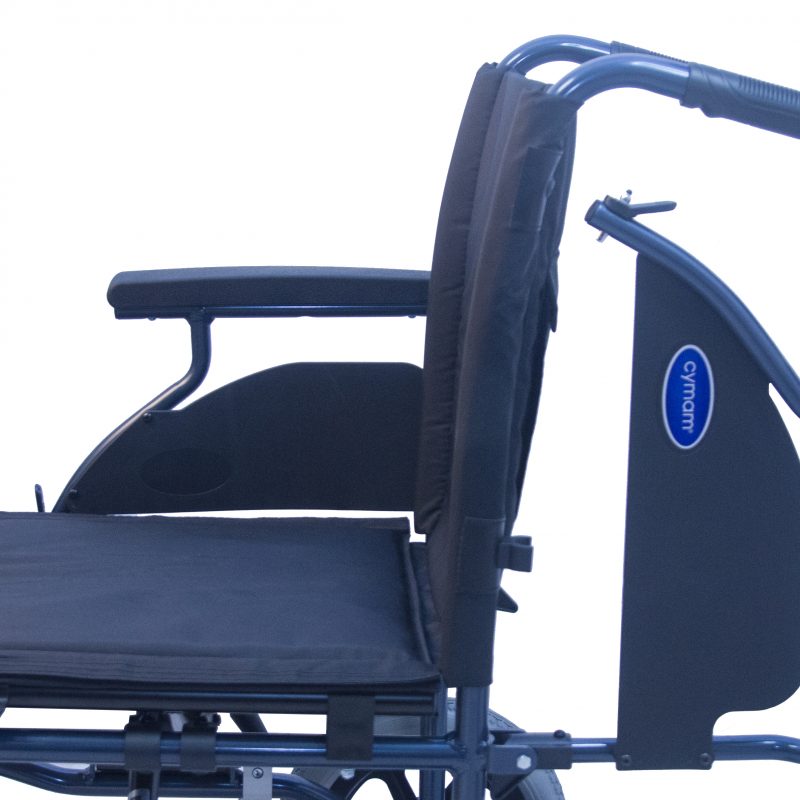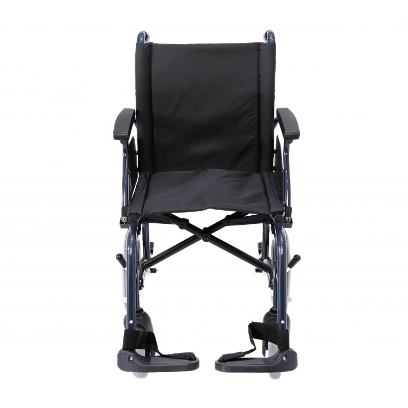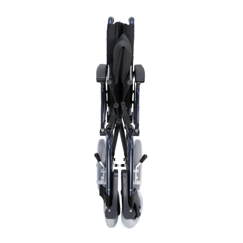 Silla de acero ligero plegable, con apoyabrazos abatibles y apoyapiés extraíbles y regulables en altura. Ruedas delanteras de PU de 200 x 50 mm y traseras de PU de 300 mm anti pinchazos. Sistema de freno para el acompañante. Cinturón de seguridad. Tapicería en nylon color negro. Financiable por la Seguridad Social (Código: SRM010A)