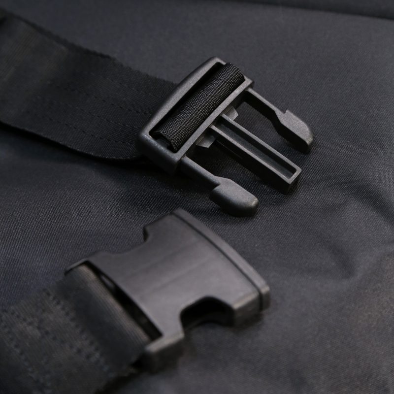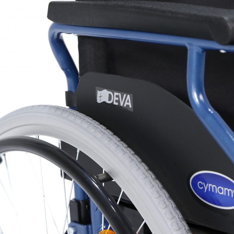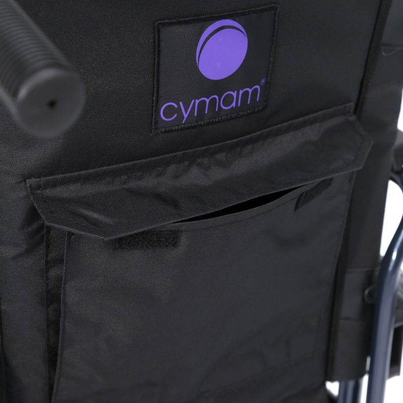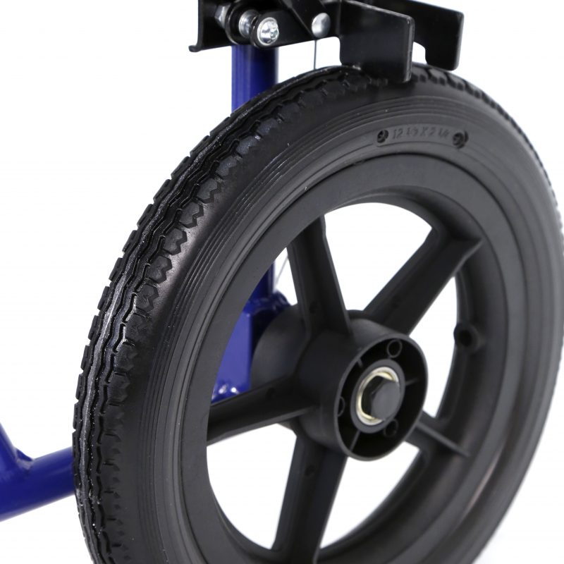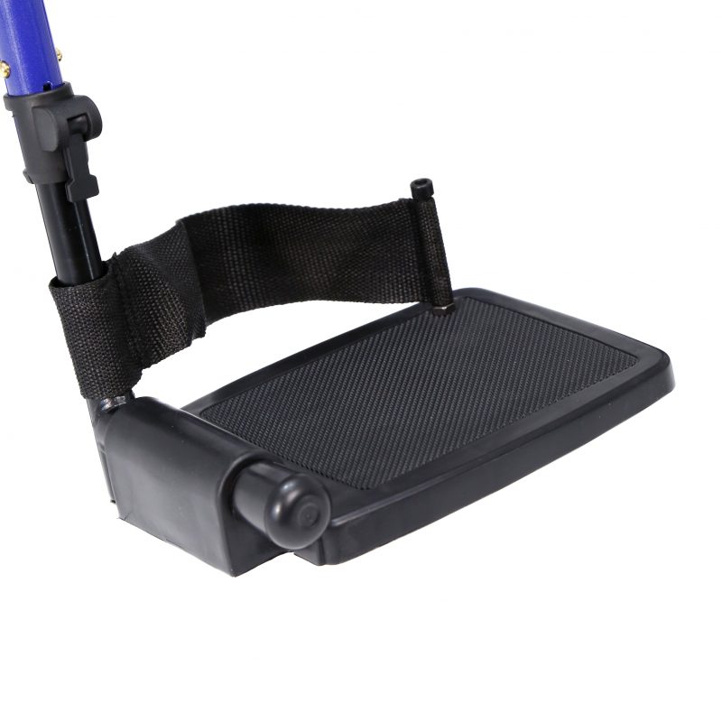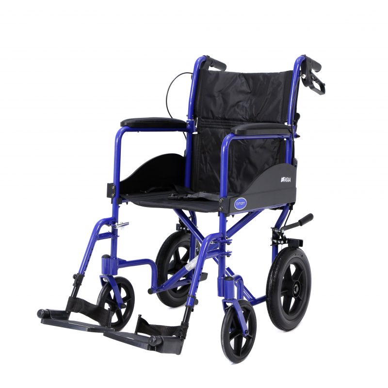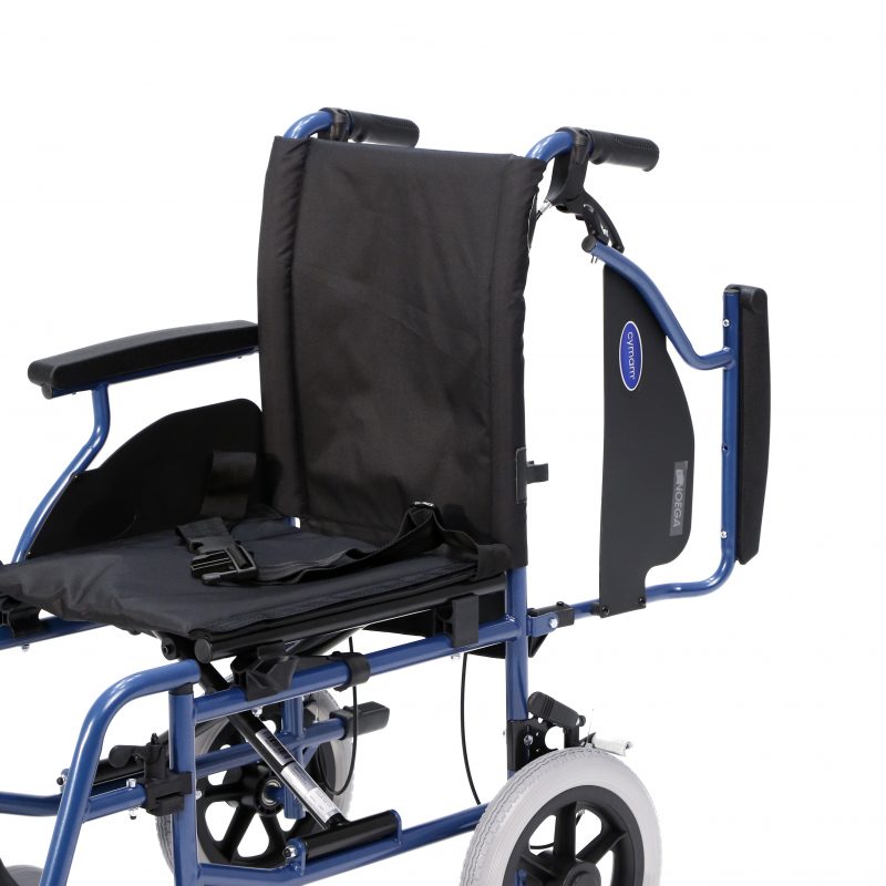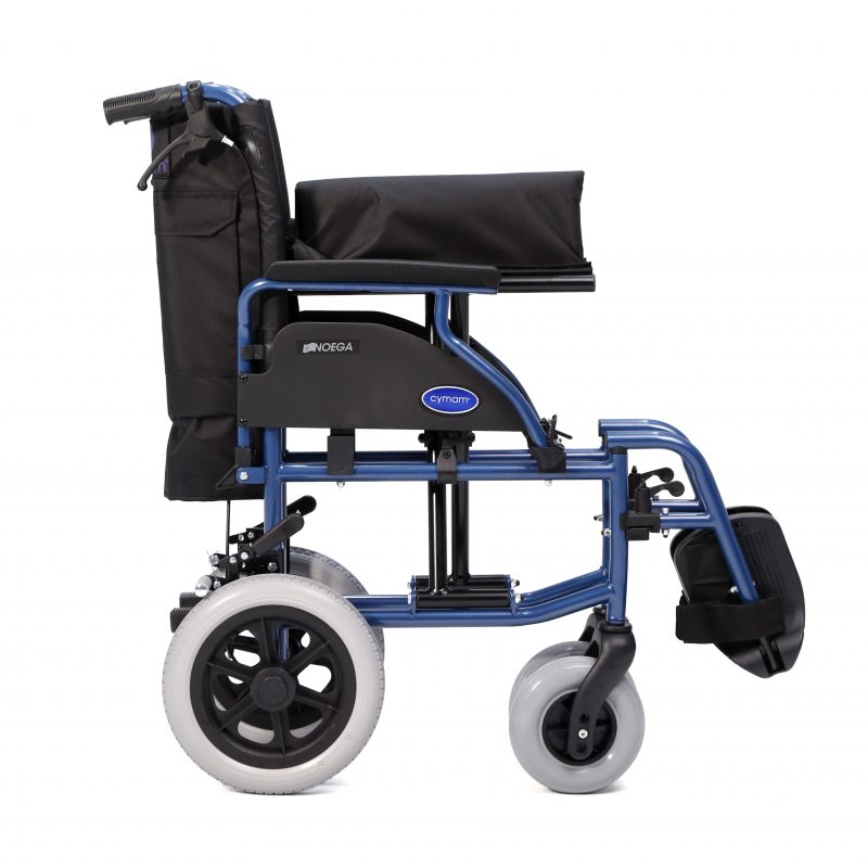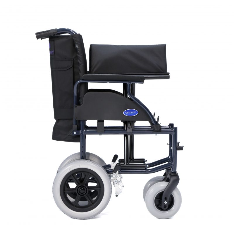 Silla de acero ligero plegable, con apoyabrazos abatibles y apoyapiés extraíbles y regulables en altura. Ruedas delanteras de PU de 200 x 50 mm y traseras de PU de 300 mm anti pinchazos. Sistema de freno para el acompañante. Cinturón de seguridad. Tapicería en nylon color negro. Financiable por la Seguridad Social (Código: SRM010A)