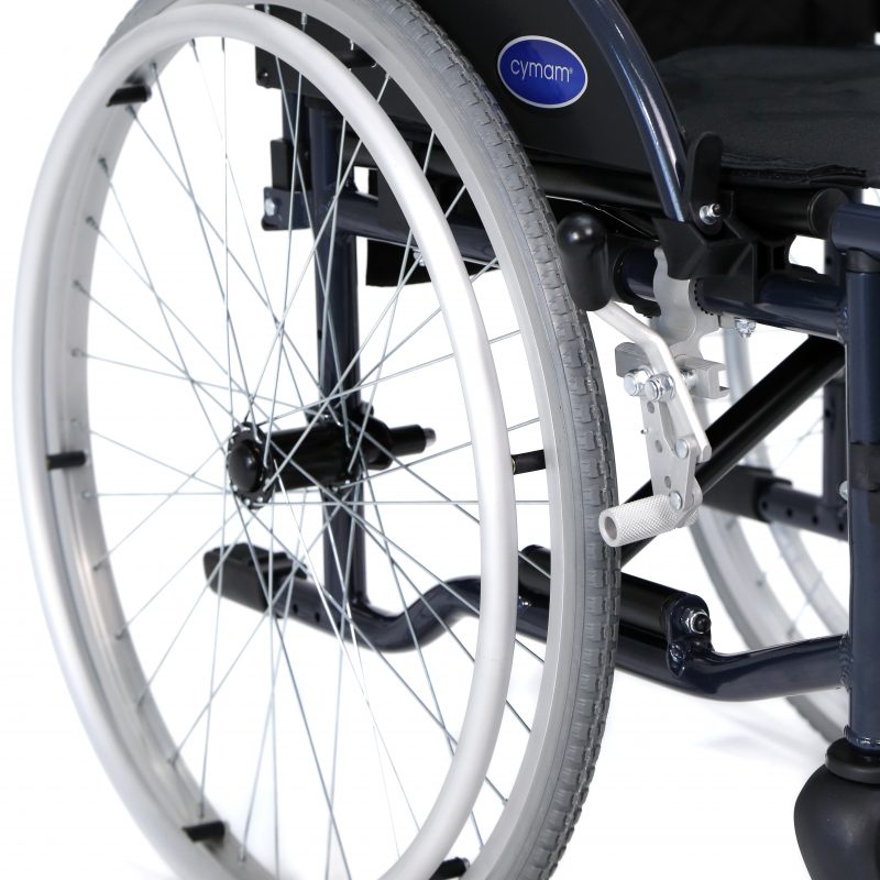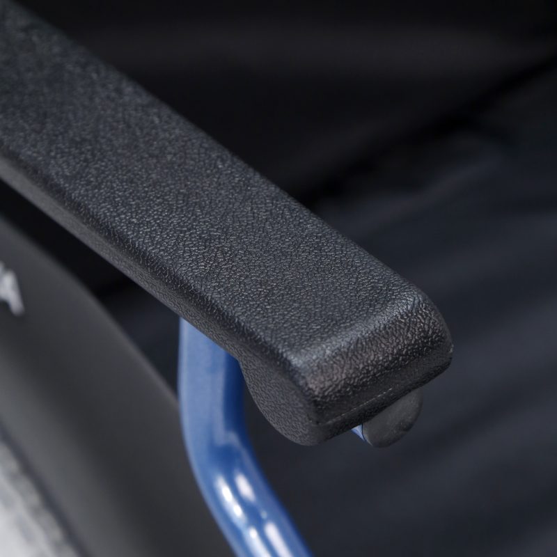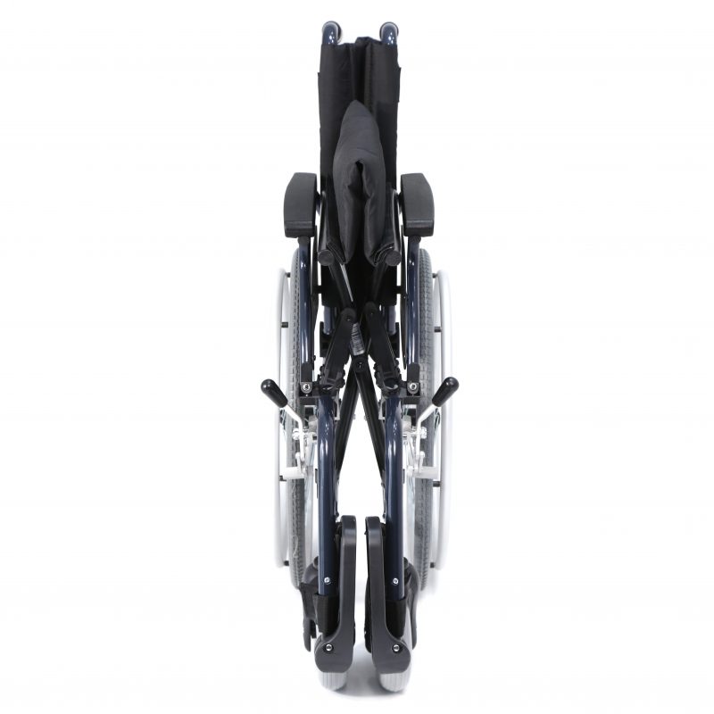 Silla de aluminio plegable, con apoyabrazos abatibles y apoyapiés extraíbles y regulables en altura. Ruedas delanteras de PU de 200 x 50 mm y traseras de PU de 600 mm anti pinchazos. Sistema de extracción rápida para las ruedas traseras (QR). Tapicería en nylon color negro. Código catálogo Ortoprotésico Nacional: SRM040D