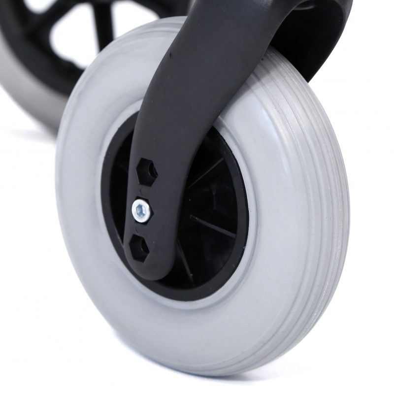 Silla de aluminio plegable, muy ligera, con apoya brazos y apoya piés abatibles. Freno de acompañante con función de bloqueo. Ruedas delanteras de PVC de 150 mm y traseras de PVC de 200 mm antipichazos. Tapicería en nylon color negro.