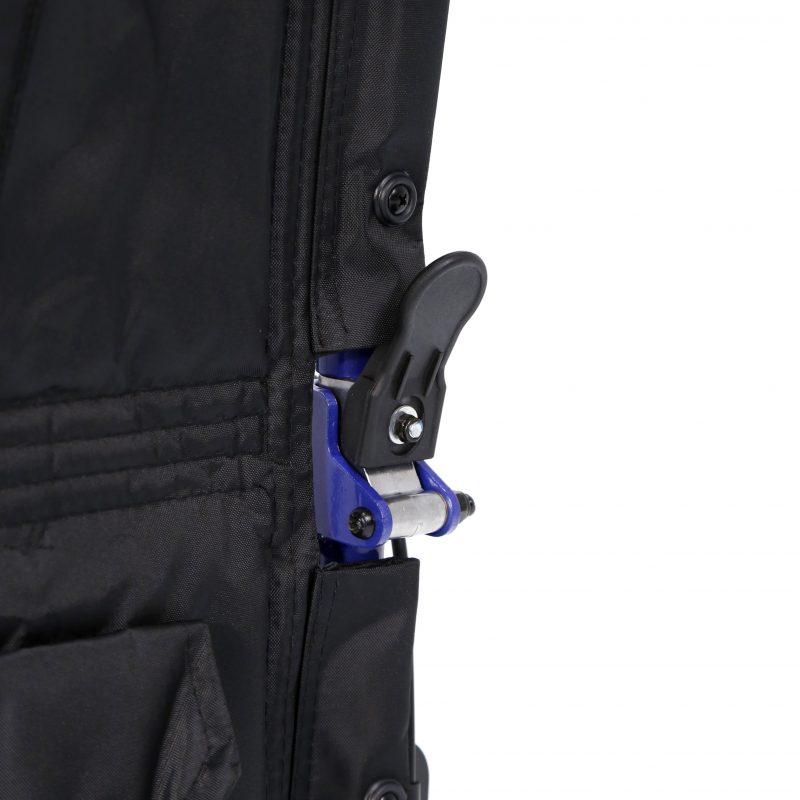Silla de aluminio plegable, con apoyabrazos abatibles y apoyapiés extraíbles y regulables en altura. Ruedas delanteras de PU de 200 x 50 mm y traseras de PU de 300 mm anti pinchazos. Sistema de extracción rápida para las ruedas traseras (QR). Tapicería en nylon color negro.